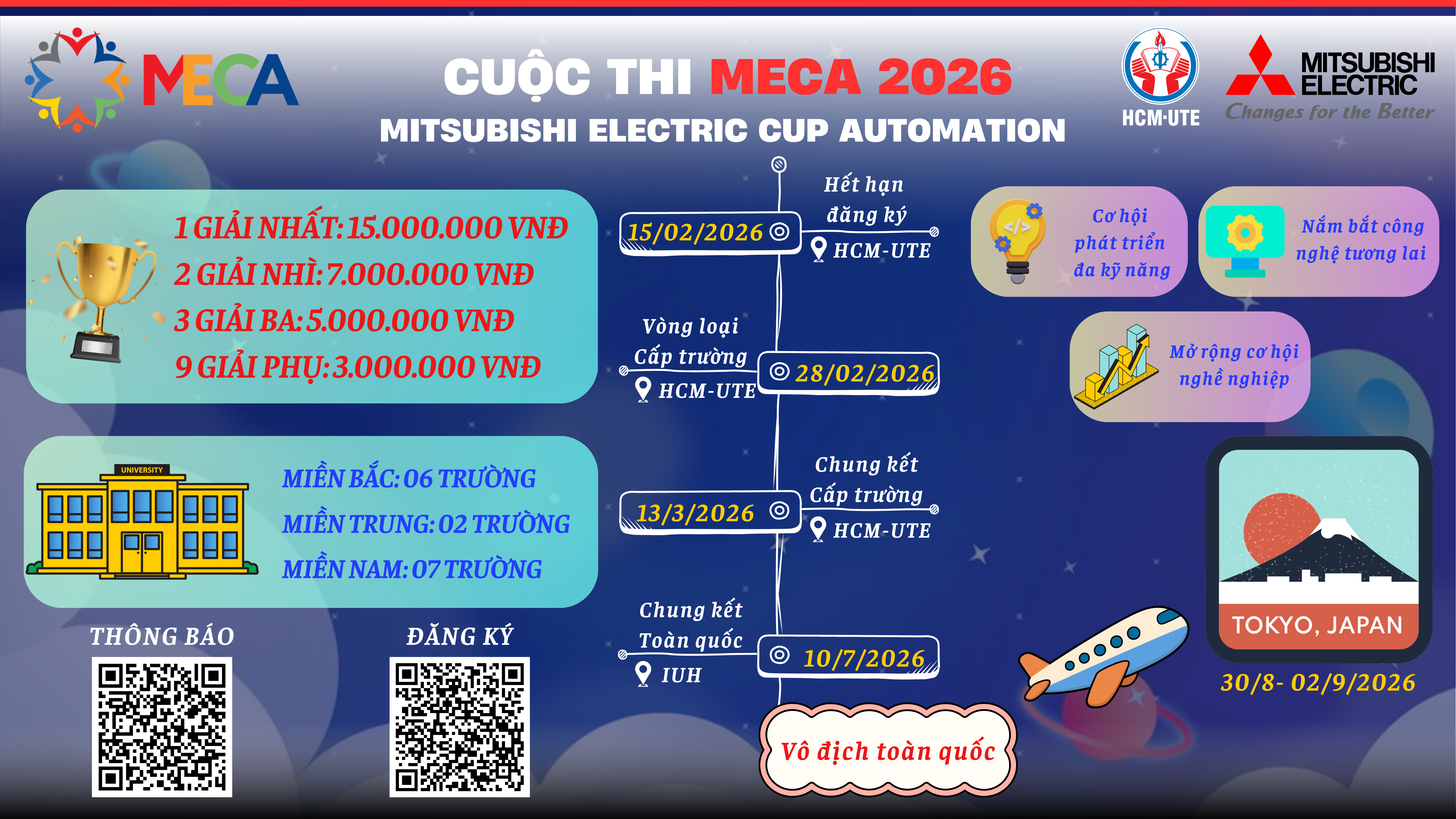 Các bạn sinh viên kỹ thuật HCM-UTE ơi! Bạn có muốn làm chủ những thiết bị công nghệ hiện đại nhất và có cơ hội đặt chân đến Nhật Bản? Cuộc thi MECA 2026 đã chính thức quay trở lại, hứa hẹn một hành trình đầy kịch tính và sáng tạo!